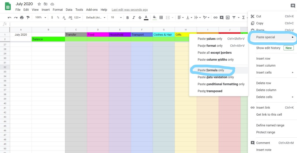Copy this cell box you just created, and “paste formula only” throughout all the cells under Deposit, and Withdraws. For the paste you will want to use “Paste Special” and then click on Paste formula only. If you skip this step your formula wont work! This makes it so that all of your other cells follow the same rule as the first.