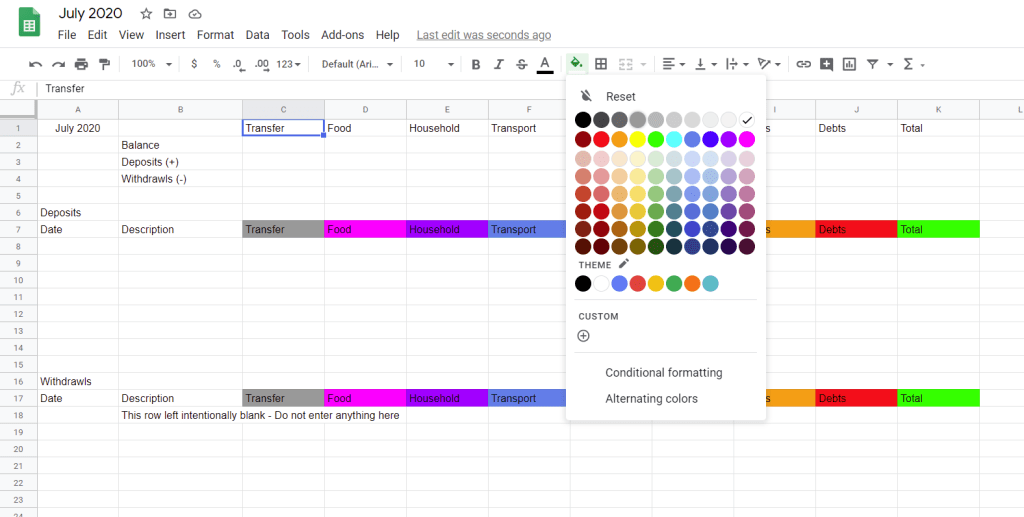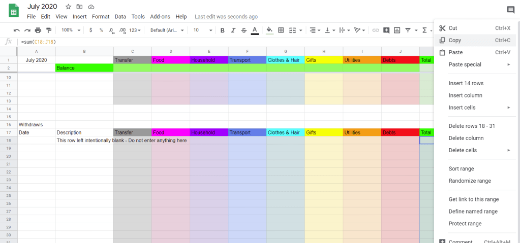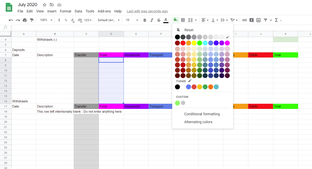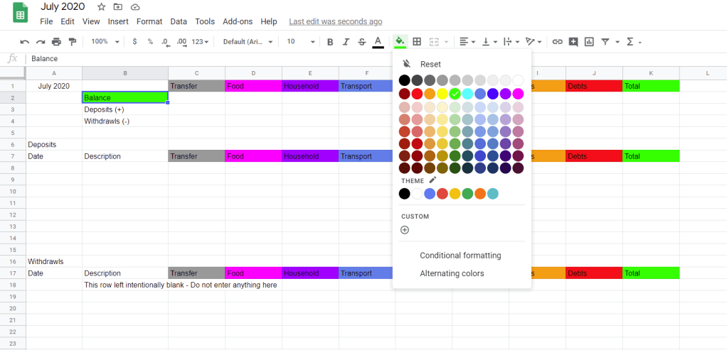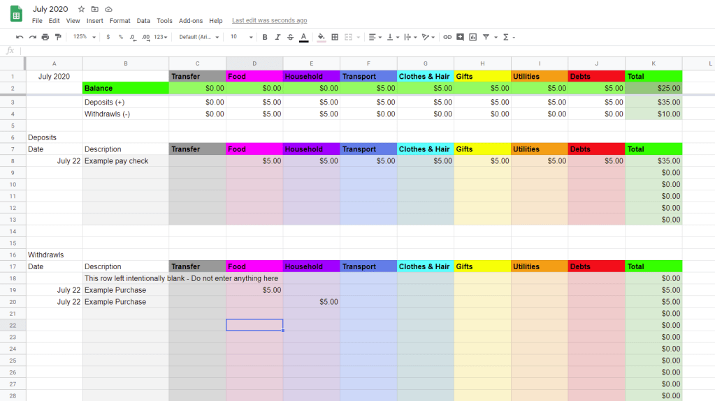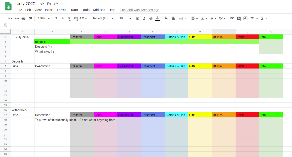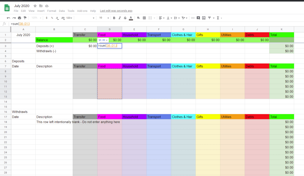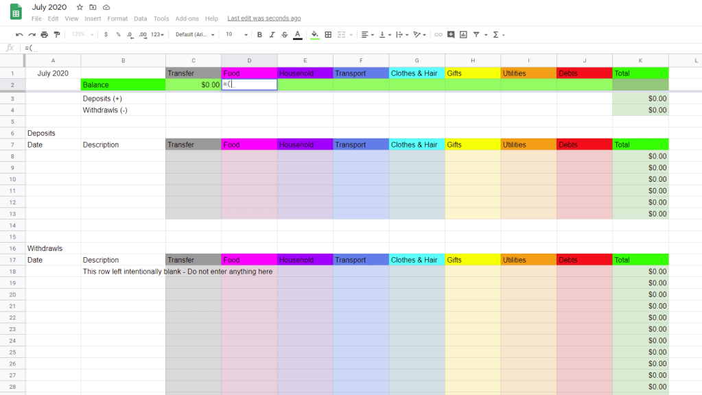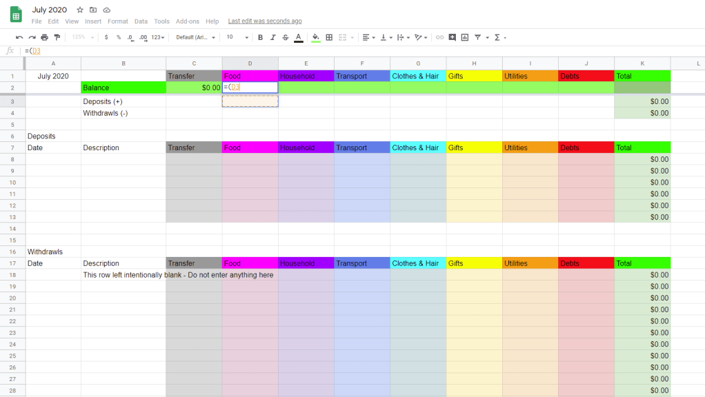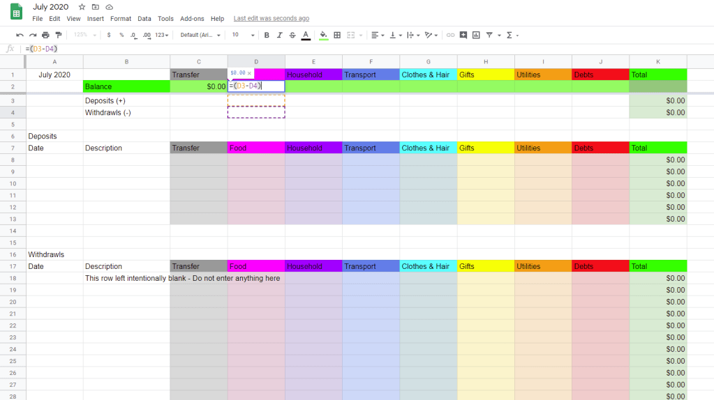 Okay, Now that we have the budget designed, we need to make it work. The goal of this budget is to enter what you’ve spent in the withdraws category and have it total up how much money you have left in each of your separate categories, and in your account overall.