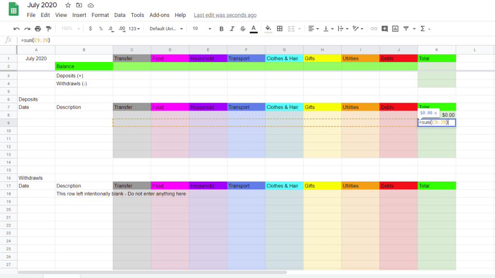 Now we need the total of all of the categories in “balance” to see what our overall balance in the bank account is. To do this click on cell K2 and enter the formula =SUM(C2:J2)